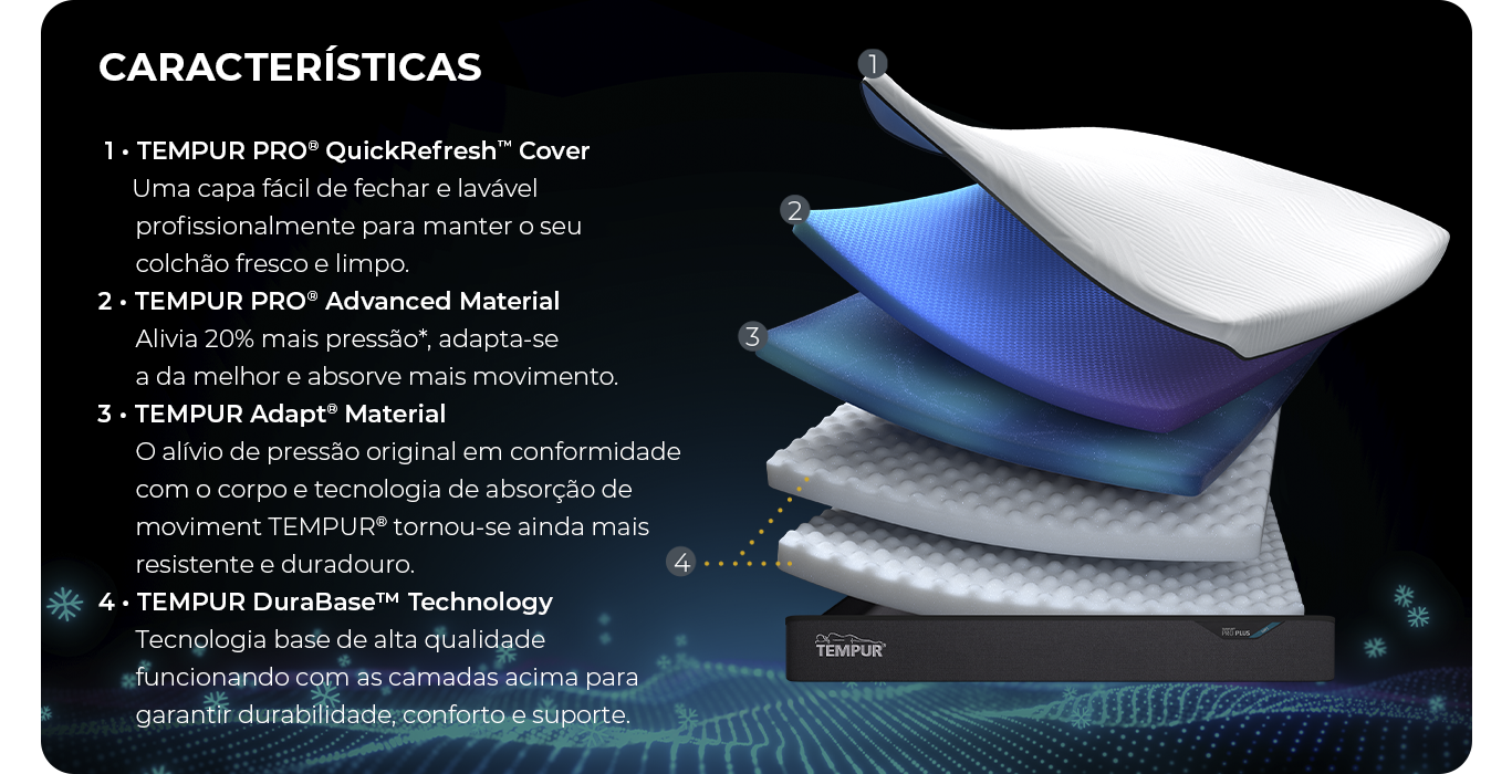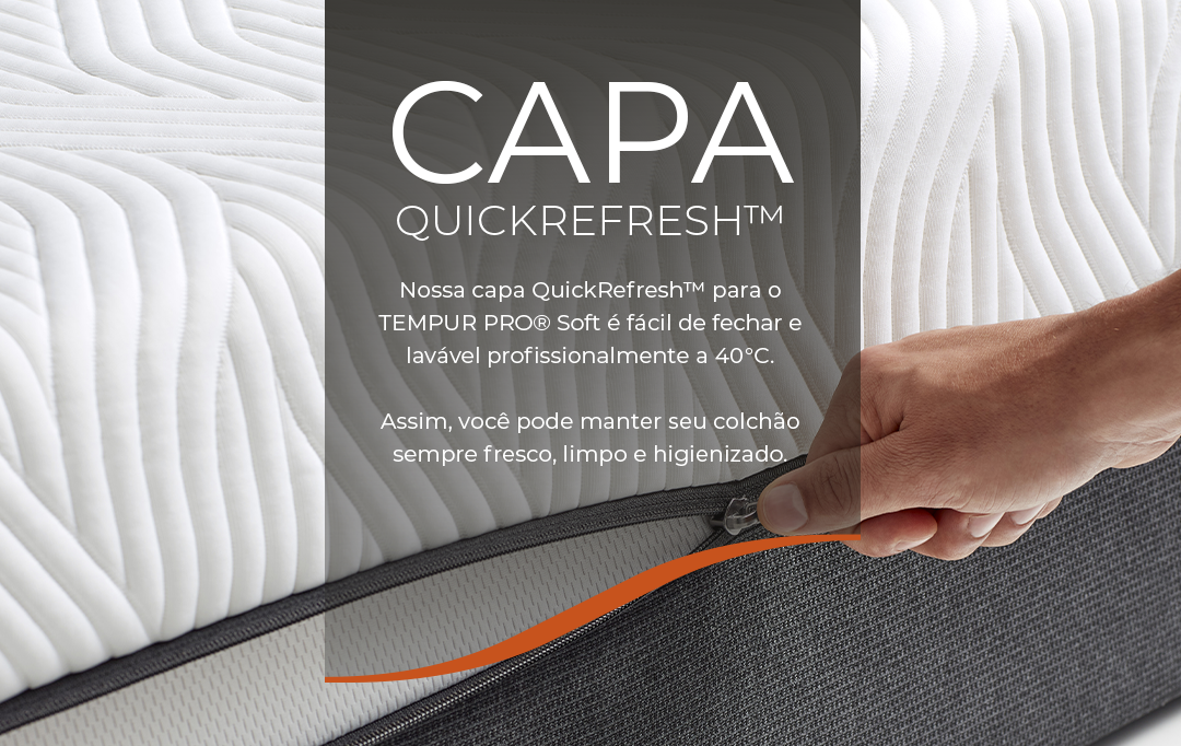 Apresentamos o novo TEMPUR PRO® Plus Soft – o nosso colchão de resfriamento mais adaptável. O novo TEMPUR PRO® Advanced Material alivia 20% mais pressão,* absorve mais movimento e se adapta ainda melhor. Além disso, a inovadora capa QuickRefresh™ com tecido SmartCool Technology™ é, lavável profissionalmente a 40°C, fria ao toque e absorve o excesso de calor para mantê-lo fresco.